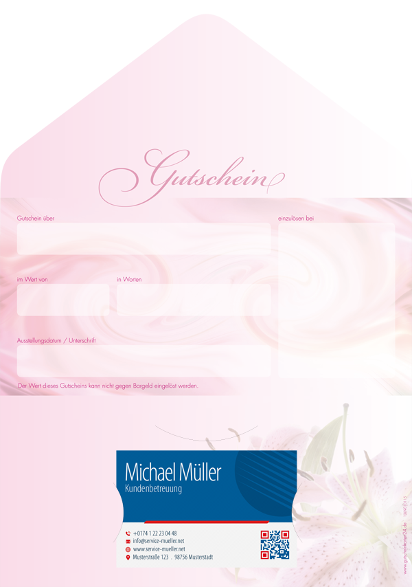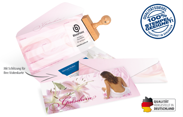Ihr einzigartiges Mittel zur Neukundengewinnung! Bieten Sie Ihrem Kunden eine praktische Geschenkidee: Geschenkgutscheine sind beliebt, modern und das beste Cash-Sofort-Leistung-Später-Instrument. Die Gutscheinkarte Classic bietet neben der einfachen Faltart zu einem Kuvert noch Einschublaschen für Ihre Visitenkarte, die als Werbemedium nicht fehlen darf. Sie zeichnet sich durch hochwertige Materialien und der "Stempel-Sofort-Trocken-Garantie" aus.