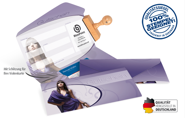 Ihr einzigartiges Mittel zur Neukundengewinnung! Bieten Sie Ihrem Kunden eine praktische Geschenkidee: Geschenkgutscheine sind beliebt, modern und das beste Cash-Sofort-Leistung-Später-Instrument. Die Gutscheinkarte Classic bietet neben der einfachen Faltart zu einem Kuvert noch Einschublaschen für Ihre Visitenkarte, die als Werbemedium nicht fehlen darf. Sie zeichnet sich durch hochwertige Materialien und der "Stempel-Sofort-Trocken-Garantie" aus.