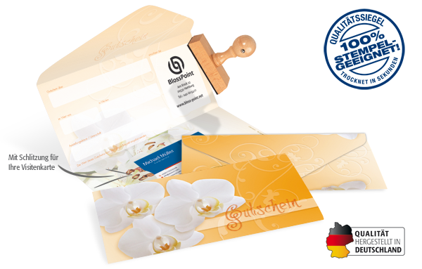 - in Kuvert-Faltform mit Schlitzung für Ihre Visitenkarte