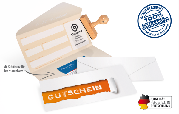 - in Kuvert-Faltform mit Schlitzung für Ihre Visitenkarte