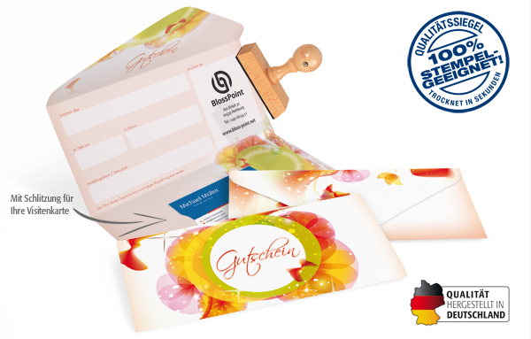 - in Kuvert-Faltform mit Schlitzung für Ihre Visitenkarte