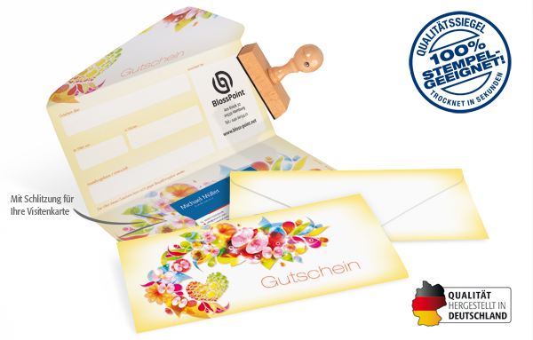 - in Kuvert-Faltform mit Schlitzung für Ihre Visitenkarte