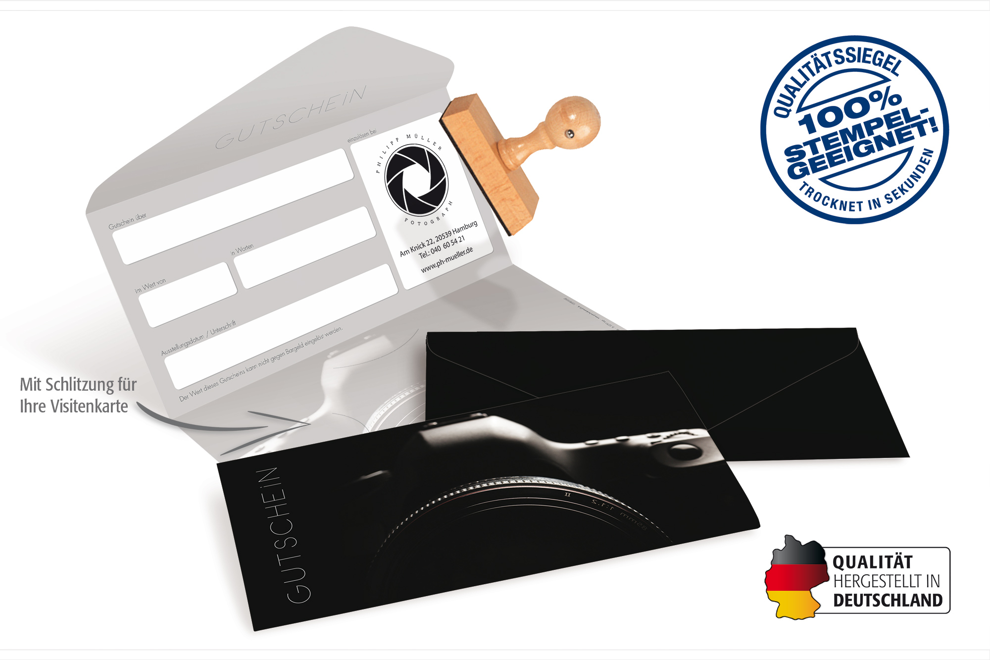 - in Kuvert-Faltform mit Schlitzung für Ihre Visitenkarte