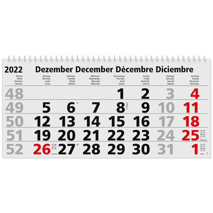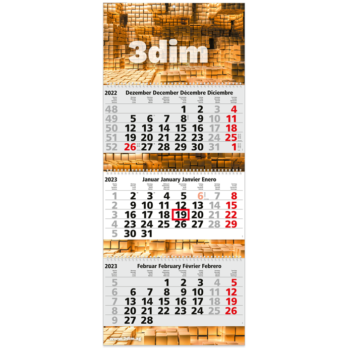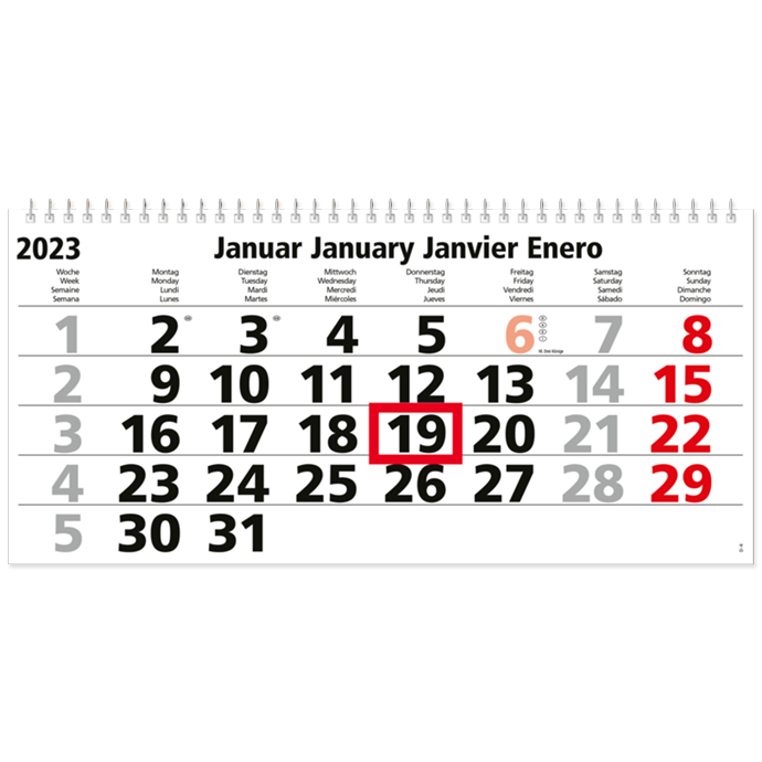 Exklusiver Mehrblockkalender als 3-Monats-Wandkalender mit Wire-O-Bindung zum leichten Abtrennen der einzelnen Blätter. Bietet die perfekte Übersicht, um laufende Termine im Blick zu haben. Die gesamte Rückwand bietet eine große Werbefläche um ihre Werbebotschaft oder ihr Logo eindrucksvoll in Szene zu setzen. Die Ferientermine werden standardmäßig unter den Blöcken eingedruckt. Damit ihr Werbekalender während der gesamten Nutzungsdauer sicher an der Wand Ihres Kunden hängt, wird er natürlich mit einer Metallöse versehen. Für den geringen Bedarf schon ab 100 Stück bestellbar. 3-Monats-Wandkalender - Minimaler Preis bei maximaler Werbewirkung.