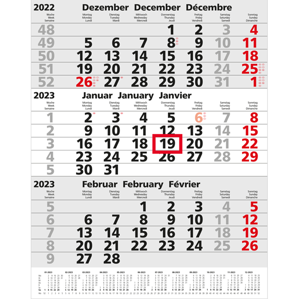 Unser praktischer 3-Monats-Wandkalender mit zusätzlicher Übersicht über das ganze Jahr in der Fußleiste, so behalten Sie alle Jahresdaten stets im Blick. Inklusive 3-sprachigem Kalendarium für Ihre internationalen Kunden. Die Abrissperforation erleichtert das Abtrennen der einzelnen Kalenderblätter. Dieser Wandkalender bietet die perfekte Übersicht, um laufende Termine im Blick zu haben. Auf der Kopflasche findet Ihre Werbebotschaft und/oder Ihr Logo den perfekten Platz. Für den geringen Bedarf schon ab 50 Stück bestellbar. 3-Monats-Wandkalender - Minimaler Preis bei maximaler Werbewirkung.