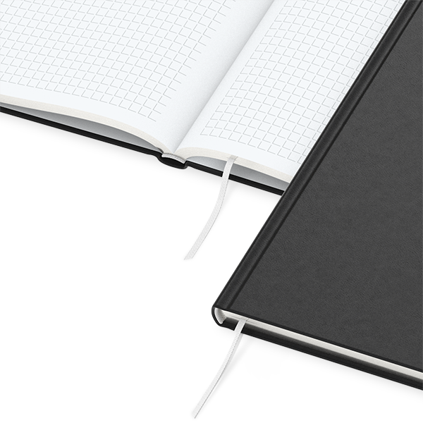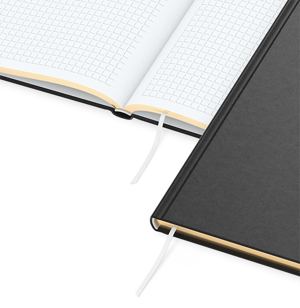 • Mit Lesezeichen, Kapitalband, Gummiband und Stiftschlaufe