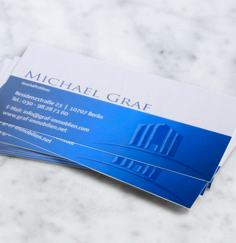 Edle Visitenkarten besitzen kreativ und stilvoll das "gewisse Etwas". Ob modern, klassisch, auffallend oder schlicht – Veredelungen überzeugen nicht nur durch ihre ansprechende Optik, sondern auch durch ihre angenehme Haptik. So kann sich Ihr Unternehmen besonders positiv präsentieren und hinterlässt einen bleibenden Eindruck.