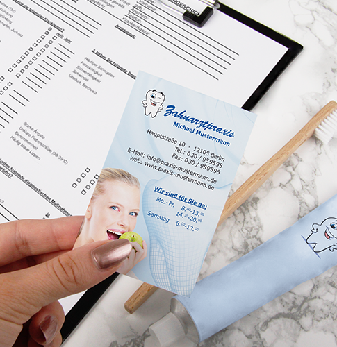 Individuelle Visitenkarten Ihrer Zahnarztpraxis werden zu einem wichtigen Kommunikationsmedium in Ihrer Praxis. Patienten werden auf Ihre Öffnungszeiten, Telefonnummer und Adresse hingewiesen und die Aufmachung und das Design der Visitenkarte repräsentieren Ihre Zahnarztpraxis.