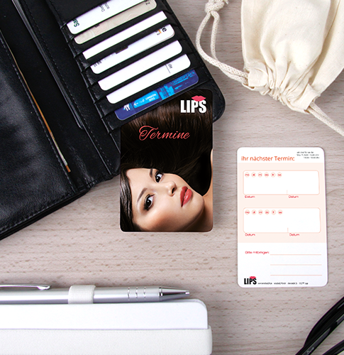 Durch individuelle Terminkarten für Ihren Kosmetiksalon können Sie Werbung für Ihren Salon mit der Erinnerung der Kunden an vereinbarte Termine verbinden.