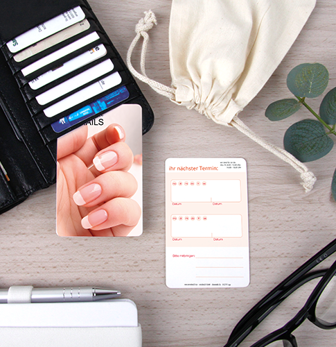 Individualisierte Terminkarten hinterlassen einen bleibenden Eindruck bei Ihren Kunden und dessen Bekannten und spiegeln die Professionalität Ihres Nagelstudios wieder. Uhrzeit, Tag und Name lassen sich übersichtlich anbringen damit Terminvereinbarungen in Erinnerung bleiben. Im handlichen Scheckartenformat passen Ihre Terminkarten Nagelstudio in jedes Portemonnaie, können aber auch an Kühlschrank und Pinnwand angebracht werden. So bleiben sie im ständigen Blickfeld Ihres Kunden und seinen Bekannten. Auf notizblock24 können Sie Ihr favorisiertes Motiv wählen und das Layout, entsprechend Ihrer Vorstellungen, ganz einfach und bequem, online designen.