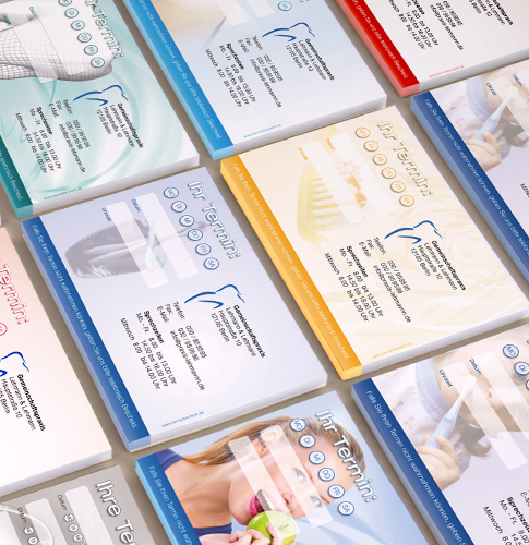 Mit Terminzetteln für Zahnarztpraxen verpassen Sie Ihren Patienten im wahrsten Sinne des Wortes einen Denkzettel, der es ihnen leichter machen wird, ihre Termine nicht zu vergessen. Auf den Terminzettel-Zahnarzt von notizblock24 können Sie nicht nur Termine eintragen, sondern auch mit Ihren Praxisinformationen bedrucken lassen. Dazu bieten wir Ihnen unseren kostenlosen Onlinedesigner, mit dem Sie online Ihre Designs auswählen und gestalten können, zur Verfügung. Fügen Sie dann einfach Ihr Logo, Ihre Praxisadresse und Ihren Name hinzu und nutzen Sie so die Terminzettel nicht nur als Terminerinnerungshilfe, sondern auch als Aushängeschild Ihrer Praxis.