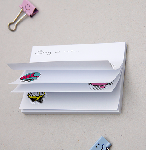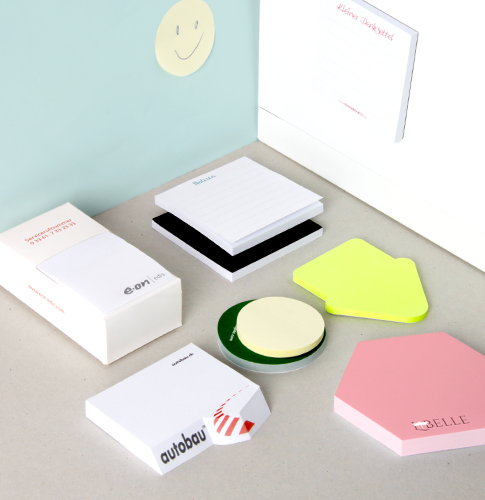 Neue und innovative Produkte wollen auch innovativ und frisch beworben werden. Wir helfen Ihnen den gern gesehenen "Aha"-Effekt auszulösen. Fragen Sie uns nach Veredelungsmöglichkeiten und weiteren Haftnotizvarianten wie zum Beispiel Haftnotizblöcke mit Formstanzungen, Haftnotizblock im Umschlag oder Haftnotiz-Set.